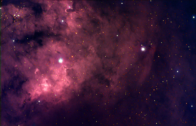 is located in Cepheus. It is a bright nebula described in the 'Deep Sky Field Guide' to U2000 as "...brightest in the NE sector. The N part is broken up by absorption patches." North is down in this partial image.