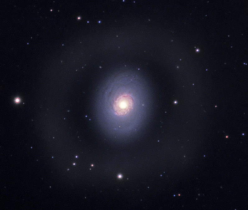 M94 is classified Sab because of its extremely bright inner region. This bright circular disk is surrounded by a ring of active star-forming regions, traced by blue young star clusters which sharply separates it from a much less bright outer ring of an older yellowish stellar population. In the outskirts, this region however ends again in a ring with moderate star formation activity, so that M94 is one of the relatively rare galaxies in which two "waves" of stellar formation can be observed. In very long exposures, a further very faint ring, about 15 arc minutes across, becomes visible.'